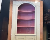 Unique four panel lower door accompany the arched top raised panel upper doors. Overall width 46” x 80” height x 16” deep. The original brass hinges are poor condition. Very attractive eye appeal with original salmon colored interior. $1,250 |