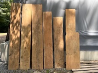 Incredible condition and color. Top edge is chamfered/eased on up and down sawn lumber. 1-1/8” thick x 6” wide. Six 8’ sections and one 52”. $300 lot |