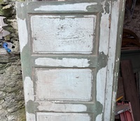 New Hampshire origin in old blue paint. Moulding still needs to be stripped. Original cast iron butt hinges. Measures 21”W x 78”H x 3/4” $125 |