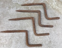 Hand Forged Drive-In Style Hook/Brackets (4 pieces) Drive-in leg measures 6”, legs can accommodate 3” x 3”. Can be used in at least two orientations. Upright legs each have a matching location hole drilled to secure any attachments. $25/set |