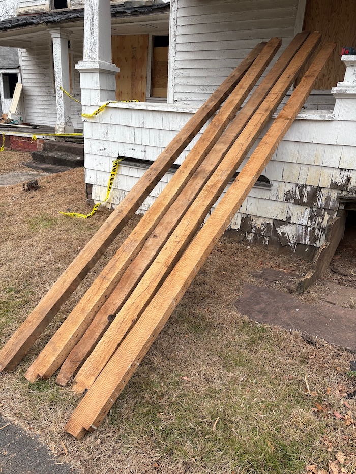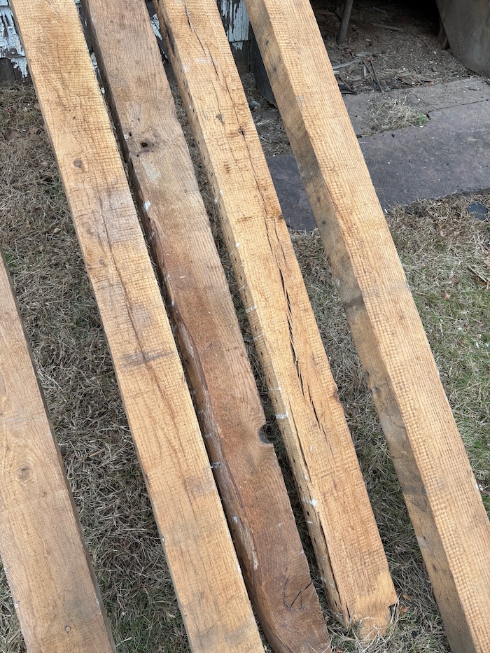 Up and down sawn, honey-colored, 3” x 5” x 13’ (shoulder to shoulder)length. TEN available. Ideal for rafters or exposed ceiling installation.