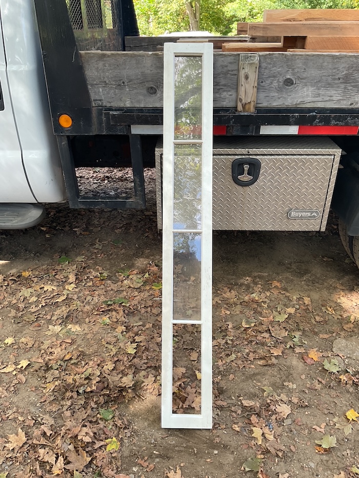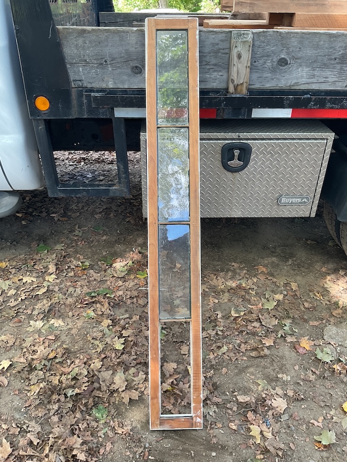 8-1/4” x 64-1/2” x 1-1/8” Vintage wavy glass. One 5” x 15” pane is missing. Replacement glass will be provided.
