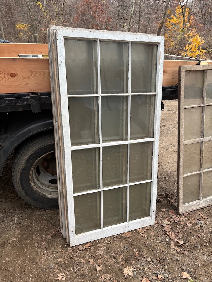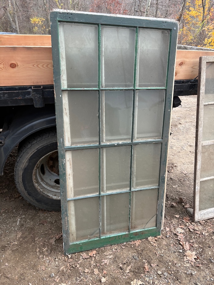 Six matching available. Measure 31” x 62” x 1-1/8”. Wavy cylinder glass. Ideal for a small greenhouse. Some cracked glass. Replacement will be provided.