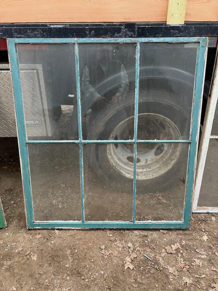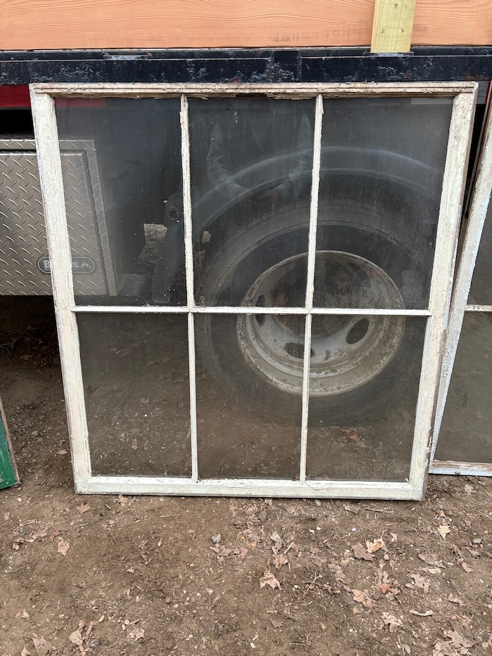 Measure 40”W x 43”H x 1-3/8”. Glass is vintage wavy cylinder glass which measure 12” x 20”. Some missing or cracked panes. Replacement glass will be provided. Seven available.