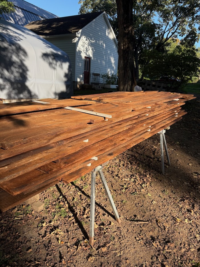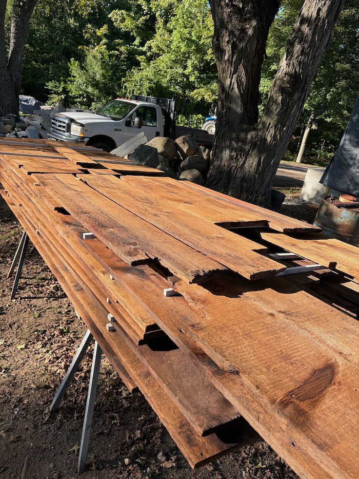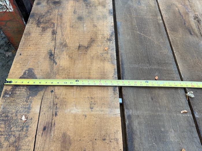 Attic flooring with light nailing. Up and down sawn in an incredible golden honey coloration. All power washed and ready to use. Boards are a full one inch thick and range in width from 12”-16”, mostly 14”. Lengths are mostly 10’ and 12’ with two at 17’ length. 475 square feet, generously measured.