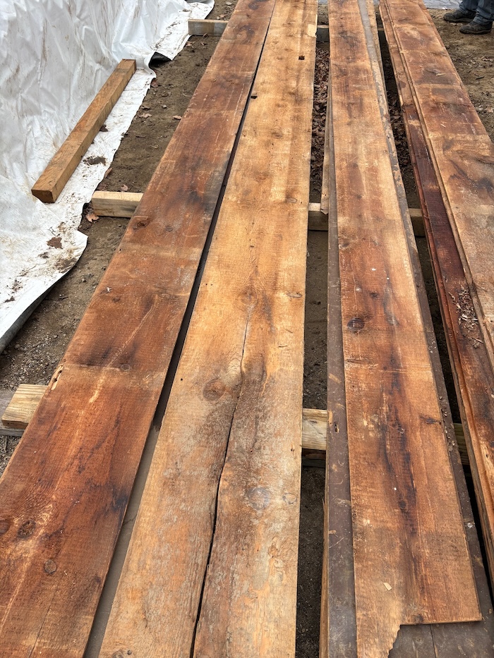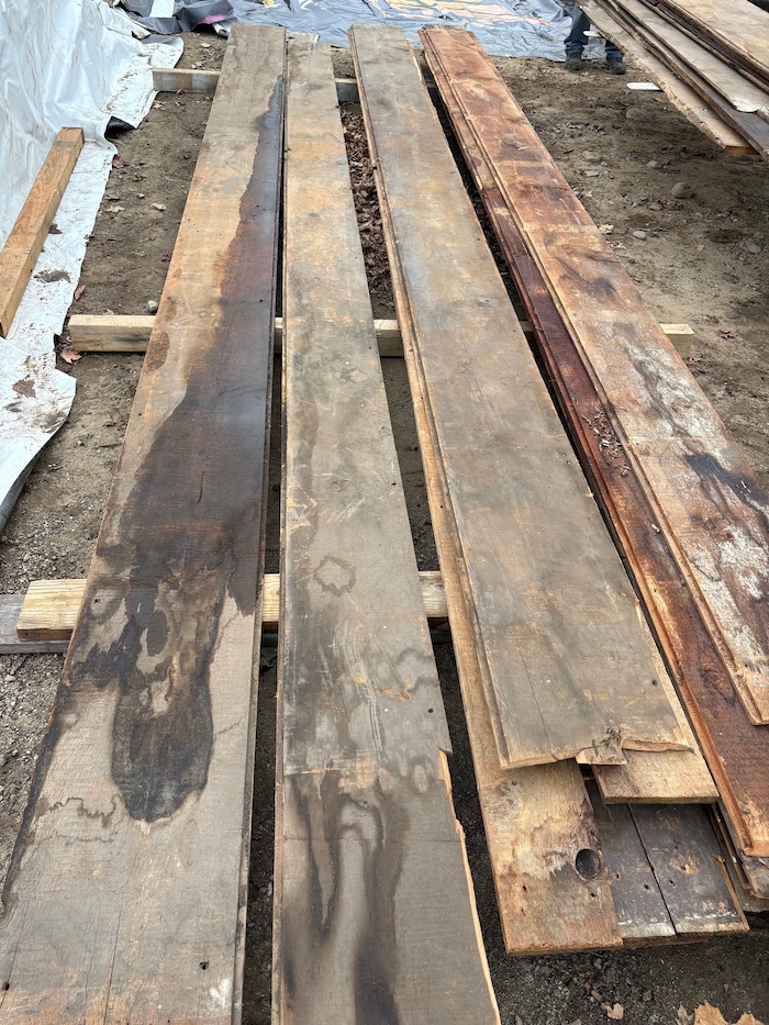 Original dry, unpainted surface. Foot worn, up and down sawn. Half of this batch is 18’ and 19’ length. Many in 12’ length. Shiplapped, presently unwashed due to cold weather. 12” average width. Central Connecticut origin. Board shown is not stained, it is wet. Top surface and reverse sides shown. 390 square feet.