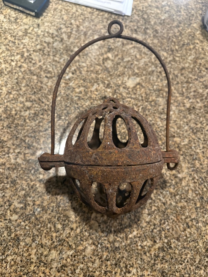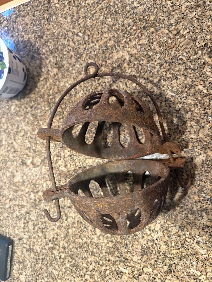 Cast iron clamshell style to load a ball of string. This particular style hung overhead via the loop shown. It is generally 6” wide x 10” tall. Excellent condition. Will clean up nicely.