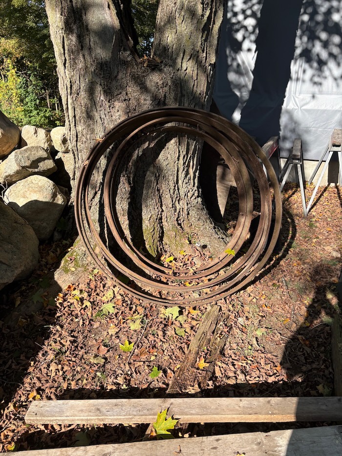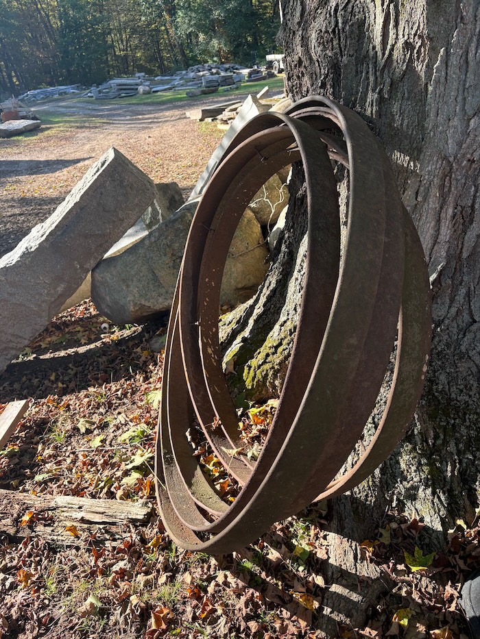 We currently have 6 available in diameters from 40” to 55” The rims are hand forged and are 1/2” thick x 3-1/2” wide. Solid condition. Ideal for a garden accent or planting surround.