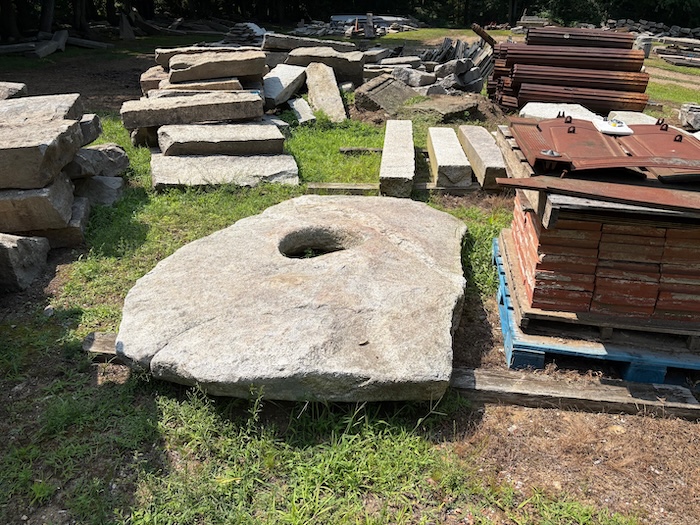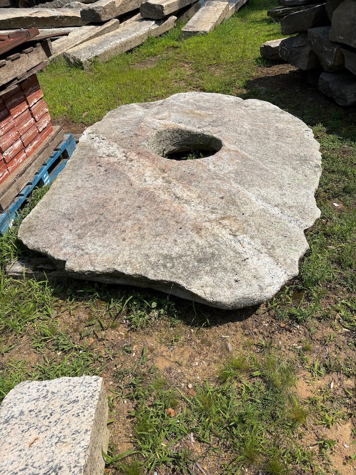 We have had the opportunity to offer these from time to time but this one is a TEN !! The body center is thickest at 8” and gently, symmetrically, flows to all sides to about 4” thickness. The center hole is nicely worn and is 18” diameter. It has a great grain of color running through. Overall measurements are large: 5’ x 7’-6”. It can be quite a focal point.