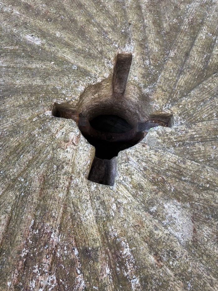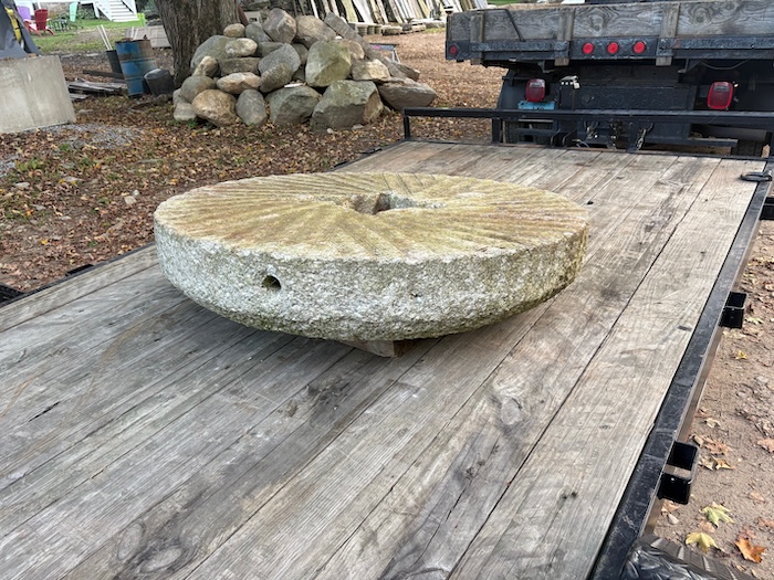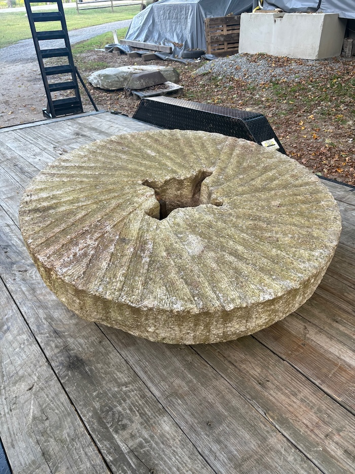 Another “10” !! New York State origin. Measures 49” diameter x 10” thick. Prominent grind grooves in the feather pattern. Original drive iron intact. Green pallor is mold from its damp and shaded last location.