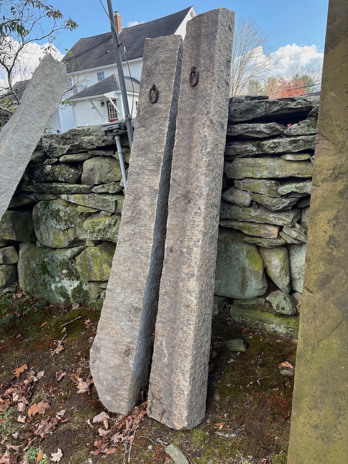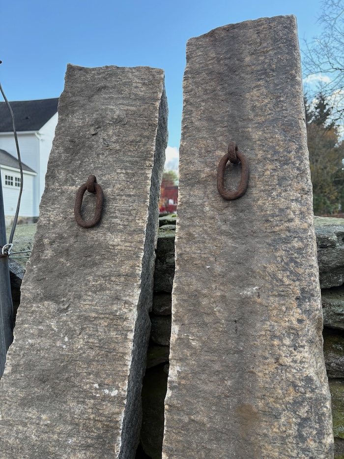Tall pair of matching posts in a medium tan hue. They have period hand forged oblong rings. Measure 7” x 9” x 84” (7 feet)