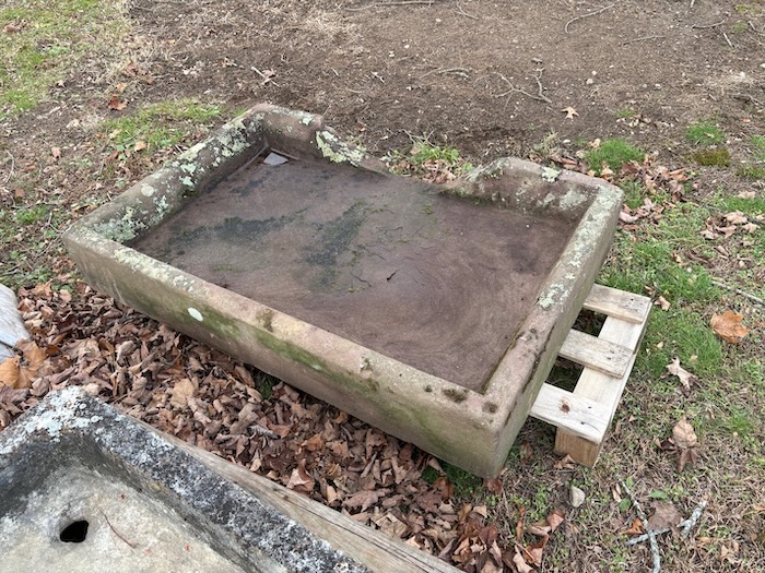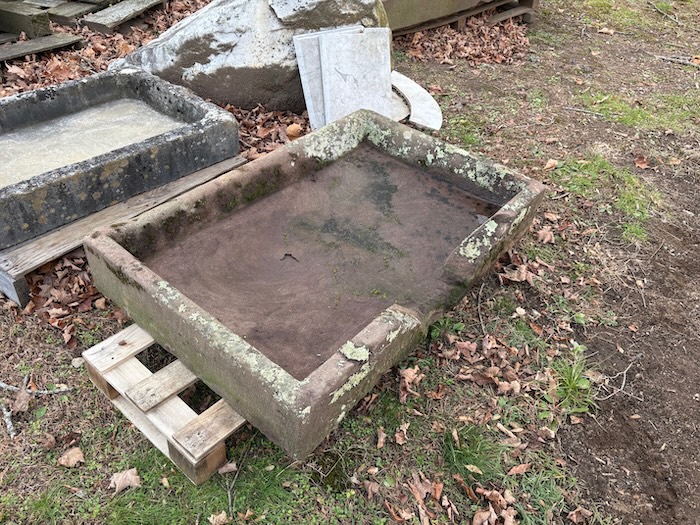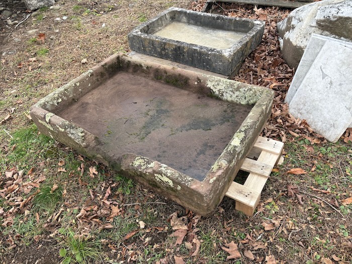 This is an early sink which most probably had a spout. As shown, there is a rim opening which may be integrated into a water feature or similar garden application. Measure 27” x 41-1/2” x 7”. Great eye appeal.
