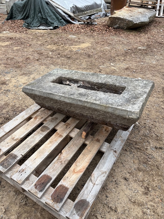 Vintage medium grey color. Dough bowl/trencher form. Each measures 22”W x 42”L x 11”H. Through center cut out measures 6” x 27”. Incredible eye appeal.